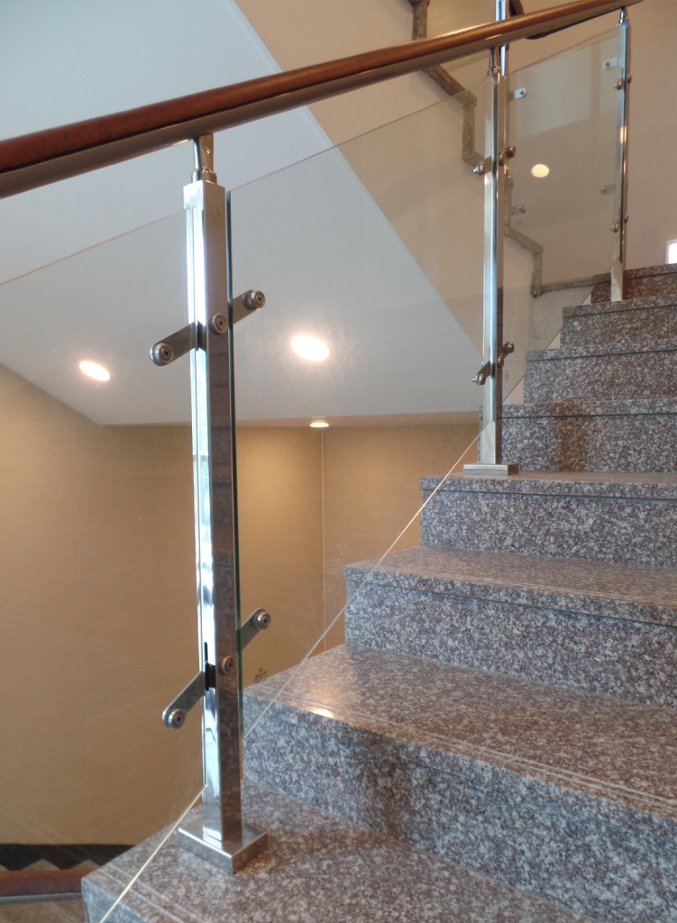 Handrail post [40 x 40mm SST pipe] + SST plate glass holder set + Ø25.4 SST handrail connecting pipe + Base plate + Base cap